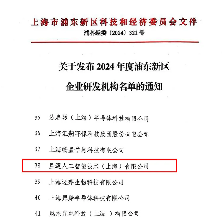 近日,根据《浦东新区企业研发机构认定管理办法》(浦科经委规〔2019〕1号)文件的规定和要求,浦东新区科经委完成了2024年度企业研发机构的认定审批工作,星逻智能成功入选“2024年度浦东新区企业研发机构”认定名单。